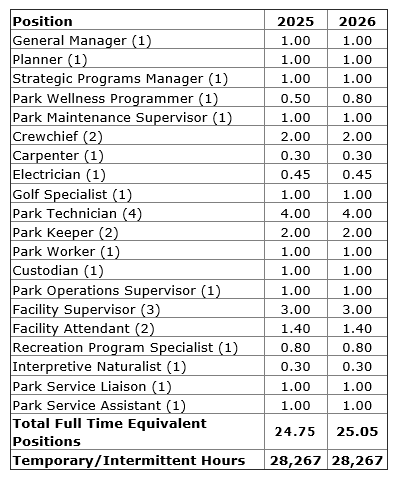 The 2026 budget includes an increase of the park wellness programmer from 0.5 FTE to 0.8 FTE funded by the Met Council Wellness grant. The following is a summary of the 2026 budgeted full-time equivalent positions and temporary hours.