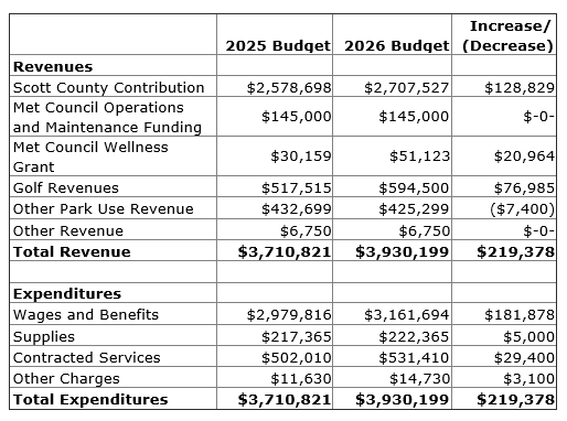 On December 16, 2010, the Park District and Scott County entered into a joint powers agreement that defines the roles and responsibilities for operations and maintenance of all regional park facilities in Scott County. The agreement requires the preparation and adoption of an annual budget. The staff listed above, along with Tom Balk and Justin Markeson (supervisors for the parks in Scott County) and other staff, reviewed operational needs and compiled a draft 2026 budget.