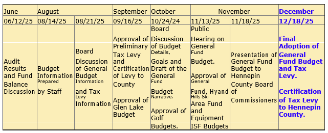 The Board of Commissioners approved the 2026 General Fund Operating Budget on November 13, 2025, and pursuant to state statute, it was submitted to the Hennepin County Board for consideration. The County Board reviewed the Park District's budget on November 18, 2025. Superintendent Carlson made a short presentation regarding the budget. County Commissioners commented and complimented the Park District for its work on the Mississippi Gateway Regional Park, its services to community members, its stewardship of the environment, and its collaboration with cities and other partners in the region.