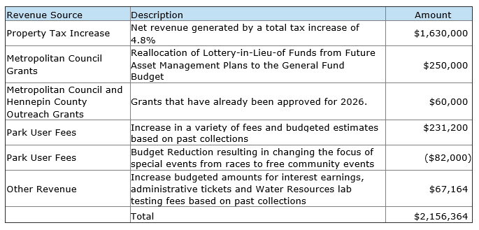 Item 5H. 2026 General Fund Budget DiscussionShare Item 5H. 2026 General Fund Budget Discussion on Facebook Share Item 5H. 2026 General Fund Budget Discussion on Twitter Share Item 5H. 2026 General Fund Budget Discussion on Linkedin Email Item 5H. 2026 General Fund Budget Discussion linkCLOSED: This discussion has concluded.Superintendent's Recommendation: NO ACTION REQUIRED; THIS ITEM IS FOR INFORMATION AND DISCUSSION. Prepared By: Howard D. Koolick, Chief Financial Officer and Jason McGrew-King, Intergovernmental Relations and Communications Supervisor Background: The Superintendent has led senior management through the budget process and is ready to recommend the 2026 General Fund budget to the Board of Commissioners. The 2026 Recommended General Fund budget totals $55,413,013; an increase of $2,156,364 over the 2025 budget. The following table shows the major revenue increases for 2026: These revenue increases roughly follow the percentage breakdown of the existing budget with approximately 76% of revenue coming from property taxes and 24% from other sources. The recommended revenue increases are in line with the budget goal to use non-tax revenues to maintain a low annual property tax increase. A part of the budget process was a review of proposed property tax increases for communities in suburban Hennepin County. Staff was able to gather a sampling of preliminary tax increases for 24 cities. The average percentage increase for these cities was 8.87% while the range was 4.4% to 15.87%. The following is an abbreviated listing of cities from each District. - City of Bloomington - 9.44%