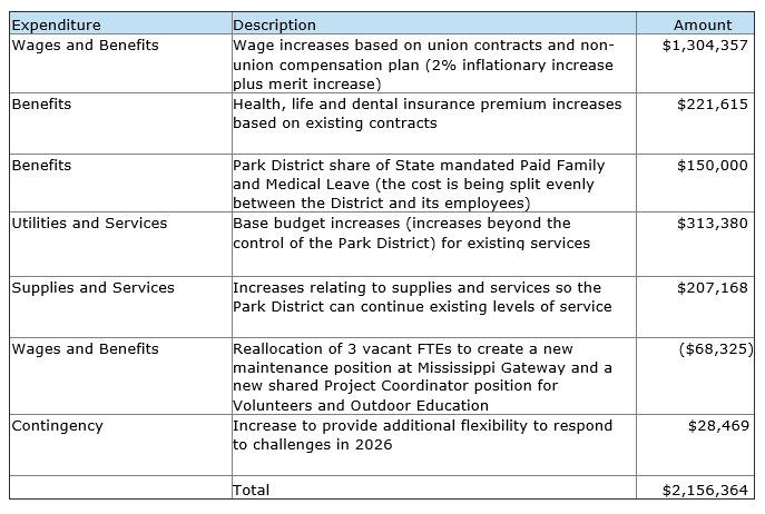 Expenditure increases were prioritized based on maintaining existing service levels, providing competitive wages and benefits to employees, meeting contractual obligations, and providing flexibility to respond to changing conditions and needs. The following table shows the recommended expenditure increases: The 2026 General Fund Budget Book, which will be provided to the Board for the November Board meeting, will contain a narrative description of the Park District, its goals for 2026 and budget changes that will help reach those goals. It will also contain a variety of tables showing breakdowns of the above amounts by department and type of revenue/expense. An initial draft of the narrative portion and several of the tables is attached for your review and comment. Relationship of Board Action to the Budget The Park District's budget process is a six to eight month process that includes a number of steps and board actions to complete. The following graphic shows how this board action fits into the budget process and where the District is in the process. The blue information on the timeline shows where we are in the budget process. Relationship to the System Plan: The Request for Action supports the following goal(s) of the System Plan: Goal 2: Parks Matter Goal 3: Lead by Example by ensuring the Park District's finances are property planned and managed. Attachments: