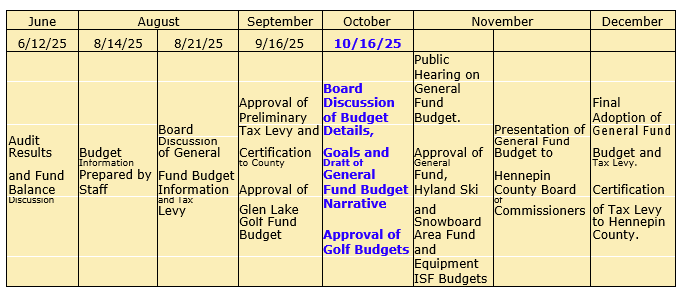 Item 5I. Schedule Public Hearing for the 2026 General Fund BudgetShare Item 5I. Schedule Public Hearing for the 2026 General Fund Budget on Facebook Share Item 5I. Schedule Public Hearing for the 2026 General Fund Budget on Twitter Share Item 5I. Schedule Public Hearing for the 2026 General Fund Budget on Linkedin Email Item 5I. Schedule Public Hearing for the 2026 General Fund Budget linkCLOSED: This discussion has concluded.Superintendent's Recommendation: MOTION TO SCHEDULE A PUBLIC HEARING ON NOVEMBER 13, 2025, AT 5:30 PM, OR AS SOON THEREAFTER AS POSSIBLE, TO RECEIVE PUBLIC COMMENT ON THE PROPOSED 2026 GENERAL FUND OPERATING BUDGET. Prepared By: Howard D, Koolick, Chief Financial Officer Background: The Park District, although not required to, has historically held a public hearing on the General Fund budget before approving and submitting the budget to the Hennepin County Board for their review. The purpose of this hearing is to provide an opportunity for the public to review the budget and provide comments to Commissioners. Staff recommends that the public hearing be held at the next regular Board Meeting on November 13, 2025. The motion sets the time of the hearing as 5:30 or as soon thereafter as possible, meaning that the hearing should begin at 5:30 pm or, if the Board is in the middle of another agenda item, shortly after the conclusion of that item. Staff is recommending a 5:30 start to allow any interested citizens who may work until 4:30 pm or 5:00 pm time to commute to the Administrative Center to participate in the meeting. At the end of the hearing, the Board of Commissioners will be asked to approve the budget and authorize its submittal to Hennepin County. Once submitted, the County has fifteen days to review and propose changes to the budget. The Park District budget and presentation will either be part of their committee meetings on December 2nd or go straight to the County Board on November 18th. The budget, with any input from Hennepin County, and final tax levy will be presented to Commissioners on December 18, 2025, for approval which will complete the budget process.