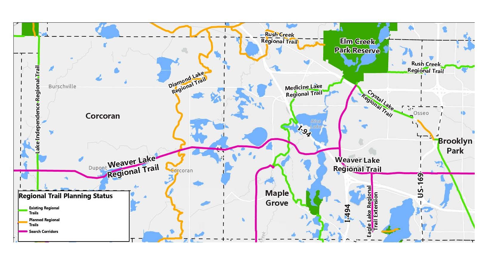 Three Rivers Park District is kicking off the Weaver Lake Regional Trail (WLRT) Long-range Plan in spring 2026. The first phase of the WLRT planning process will determine a preferred route that connects the communities of Brooklyn Park, Maple Grove, and Corcoran (see Project Map). Future extensions will be to the West Mississippi River Regional Trail in Brooklyn Park and Lake Rebecca Park Reserve in Greenfield. The WLRT will be a 10-foot-wide, paved, multi-use trail supporting biking, hiking, dog walking, running and in-line skating.
